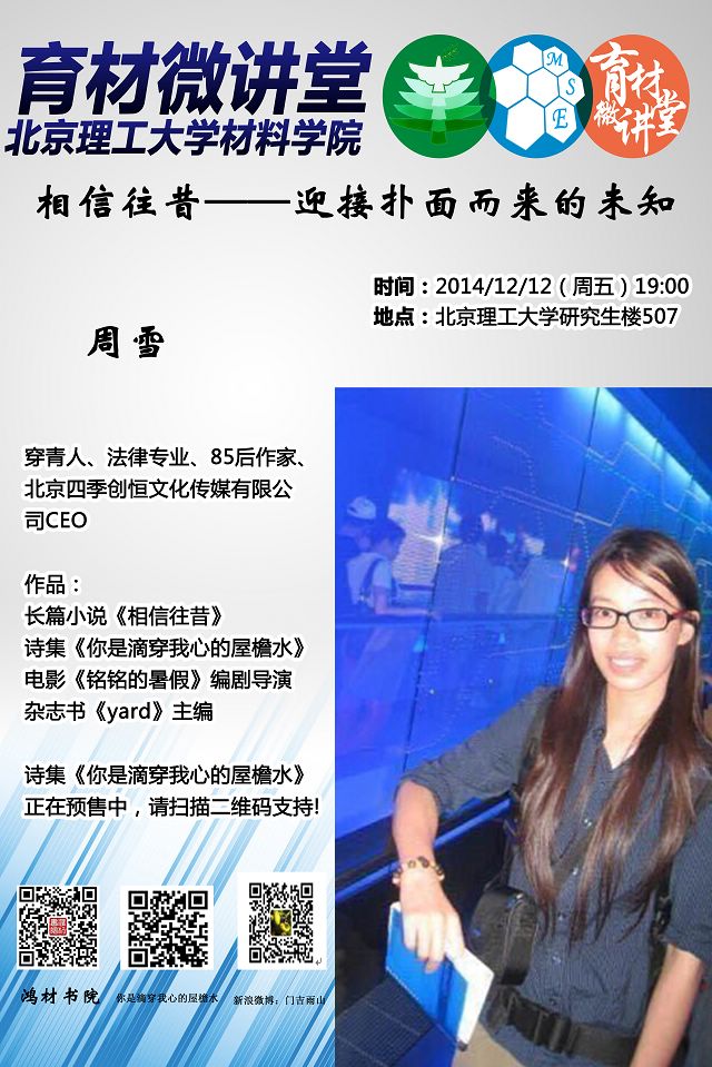 > “育材微讲堂”第十二期预告—周雪和她的《相信往昔》们