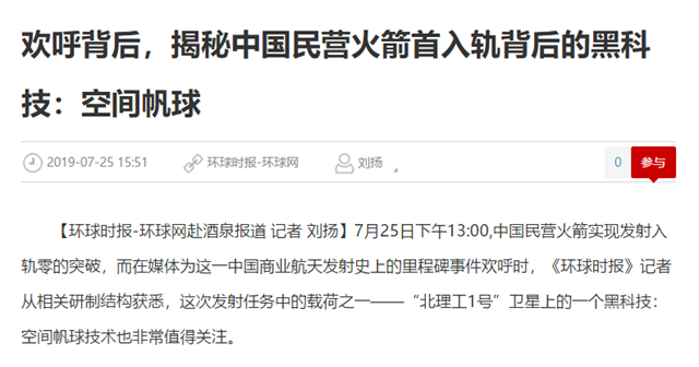 编辑:吴楠 审核:王征 阅读次数:原文标题:欢呼背后,揭秘中国民营火箭首入轨背后的黑科技:空间帆球