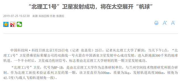 编辑:吴楠 审核:王征 阅读次数:原文标题:“北理工1号”卫星发射成功,将在太空展开“帆球”