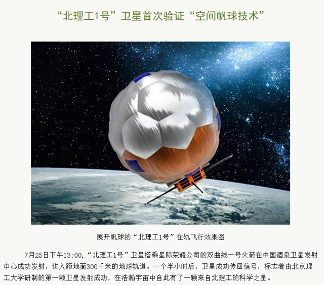 编辑:吴楠 审核:王征 阅读次数:原文标题:“北理工1号”卫星首次验证“空间帆球技术”