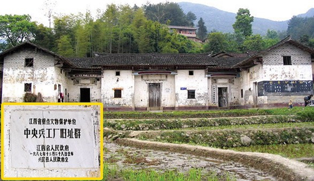 位于江西省兴国县兴连乡官田村的官田中央兵工厂,是中国工农红军在1931年10月第三次反“围剿”后建立了第一个兵工厂,它标志着我党领导的综合性大型兵工厂的形成和兵器工业的发端,被誉为人民兵工的源头和国防工业的摇篮。