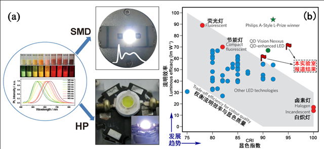 材料学院钟海政副教授多年从事CuInS2和CuInSe2纳米晶的合成工作,在此类材料研究方面处于国际先进水平。在国家自然科学基金、科技部973等项目的支持下,他利用材料学院和校微纳技术中心的研究平台,系统研究其尺寸和组分依赖的光学性质,采用组合调控策略,获得光谱在500-700 nm可调、绝对量子产率达75%的荧光纳米晶材料。在此基础上,搭建小试装置,突破了荧光纳米晶合成放大的瓶颈,实现了一次性百克量级纳米晶的制备,同时与国内外多个研究小组合作,拓展了其在发光、显示、探测等领域的应用。近期,钟海政副教授重点开发了基于CuInS2系列纳米晶荧光粉的白光LED,利用红光和绿光纳米晶荧光粉制备了贴片和大功率型的白光LED器件(参见图1a),器件显色指数>90,最高流明效率接近70 lm/W,色温在3000-11000K之间可调, 与国内外公司研发的其他LED技术相比,其显色指数和流明效率都处于先进水平,参见图1(b)。目前,他正在开展纳米晶表面界面工程研究,寻找更加合适的封装基质,如使用寿命突破1万小时,可望满足照明和显示的应用要求,将具有广阔的市场价值。