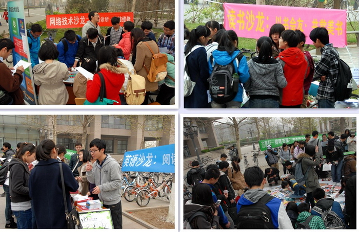 图书馆利用自己四大沙龙的影响力,由图书馆主办,绿风志愿者协会、微尘志愿者队、绿萌资源与环境保护协会、美韵英语协会、机遇与发展协会、网络开拓者协会等多个学生社团承办,先后开展了一系列活动:泊馨轩-绿萌书屋的派书活动,收集整理图书馆下架的旧杂志和在校师生不用的图书派发给需要的人,实现文献资源的循环利用;英语沙龙、读书沙龙组织了赏析中外文经典书籍活动,以书会友、在交流中一起进步;网络技术沙龙开展了网络诊所与电脑维修咨询服务;微尘的志愿者们组织了书海淘宝等多项趣味活动,让同学们在游戏活动中更加了解图书馆;绿风志愿者协会还发起了“我与图书馆”征文活动、晨读活动……各个社团在开展自己活动的同时,还积极宣传图书馆,让更多人了解“世界读书日”、“Balis馆际互借与原文传递服务”,协助图书馆完成读者满意度问卷调查工作。