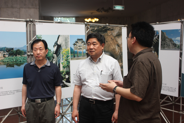 单霁翔院长在我校党委副书记、副校长李和章,校团委书记蔺伟、设计与艺术学院院长杨建明、书记郭宏等陪同下共同参观了主题图片展。中国文物学会世界遗产研究委员会副会长兼秘书长张义生也出席了此次活动,并表示学会将加强与高校的学术合作,共同搭建遗产保护的研究平台。