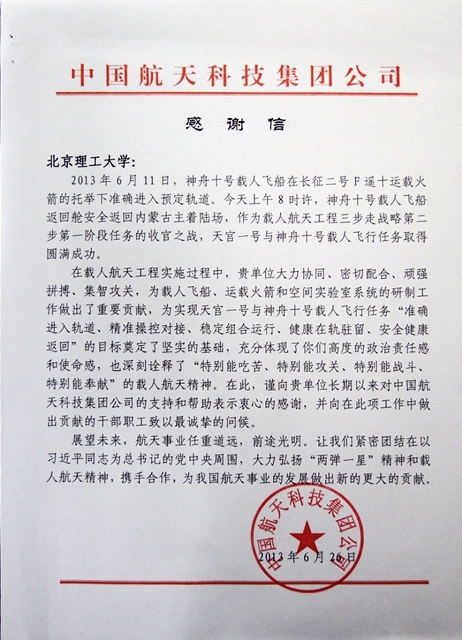 中国航天科技集团公司致信感谢北理工在神舟十号任务中的突出贡献
