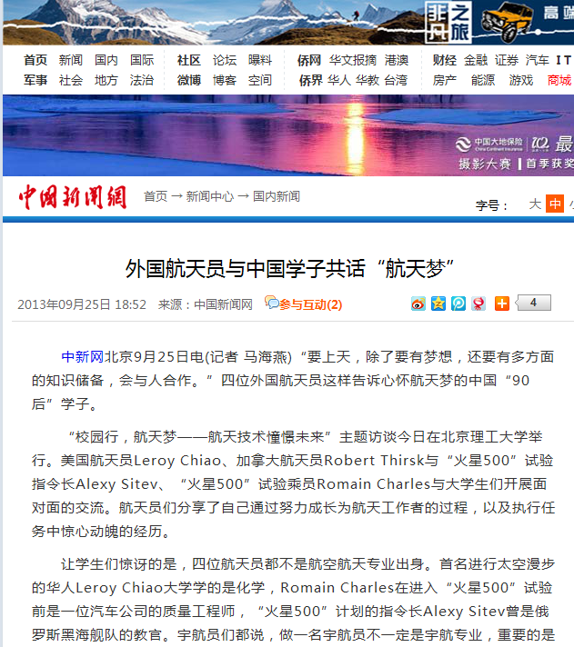 让学生们惊讶的是,四位航天员都不是航空航天专业出身。首名进行太空漫步的华人Leroy Chiao大学学的是化学,Romain Charles在进入“火星500”试验前是一位汽车公司的质量工程师,“火星500”计划的指令长Alexy Sitev曾是俄罗斯黑海舰队的教官。宇航员们都说,做一名宇航员不一定是宇航专业,重要的是一定要知道自己的梦想,并为之努力。