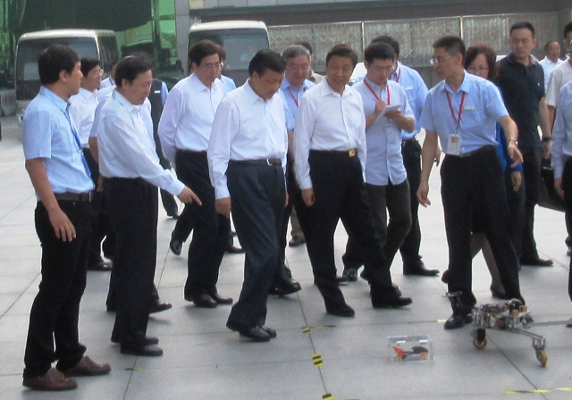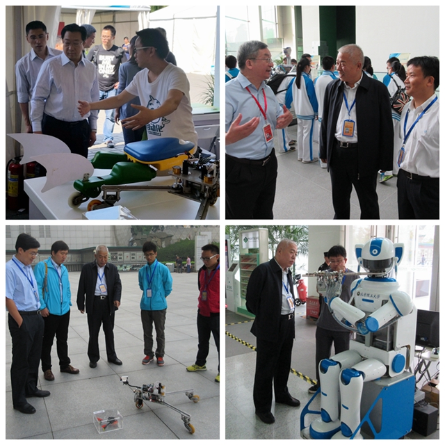 上午9时许,中央政治局常委、中央书记处书记刘云山,中央政治局委员、中央书记处书记、中央宣传部部长刘奇葆,中央政治局委员、国家副主席李源潮,中央政治局委员、北京市委书记郭金龙,十二届全国政协副主席、九三学社中央主席、中国科学技术协会主席韩启德等中央领导来到我校展台前,分别听取了机电学院黄强教授和自动化学院杨毅副教授的介绍,饶有兴趣的观看了机器人的表演,对我校师生的作品表示了充分的肯定。