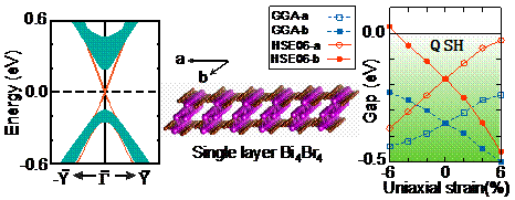 图1:单层Bi4Br4的结构示意图(中),边缘态电子结构(左),以及体能隙随单轴应力的变化(右)。