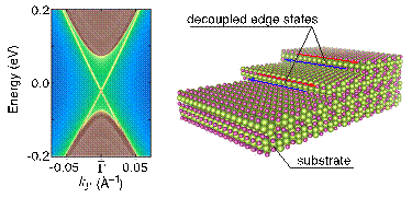 图2:三维Bi4Br4表面上的单层台阶结构示意图(右),以及单层台阶上的拓扑边缘态电子结构(左)。