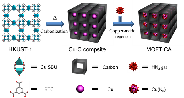 威尼斯8846爆炸重点实验室杨利教授与王博教授合作,首次创新性地实现了以含铜有机框架(MOFs)作为前驱体,通过高温碳化和气-固叠氮化反应制备得到一类静电钝感的碳-叠氮化铜复合材料。该方法的提出,有效地借用了MOFs中的结构特点,有机配体和金属离子或团簇的排列具有明显的方向性,可以形成不同的框架孔隙结构。选取含铜离子的MOFs材料作为基底,通过碳化的方式使得配体结构中的原子转变为碳原子,其结构仍会保持原有结构中的原子排序与多孔性能的存在。这种多孔性能的极大优势是使得该化合物在进行叠氮化反应时更加完全,避免了部分未发生叠氮化反应即保留着铜原子本身而影响叠氮化铜的起爆威力,也避免了在叠氮化过程中产生叠氮亚铜,增加起爆药的不安全因素。原有结构中的原子排序有效地隔离了叠氮化铜分子,降低了其在受到外界弱刺激下的敏感程度。