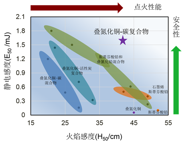 该碳-叠氮化铜复合材料具有钝感的静电火花感度,50%静电发火能量为1.6 mJ,明显高于叠氮化铜(0.2 mJ)和斯蒂芬酸铅(0.5 mJ)等常规的高能量起爆药,具有合成方法简单、安全稳定等显著优势。同时,通过该方法得到的碳-叠氮化铜复合材料10 mg就可以独立完成点火起爆黑索金,具有更小的极限药量,在航天航空、武器系统以及民用爆破器材等领域中具有极大的应用价值。