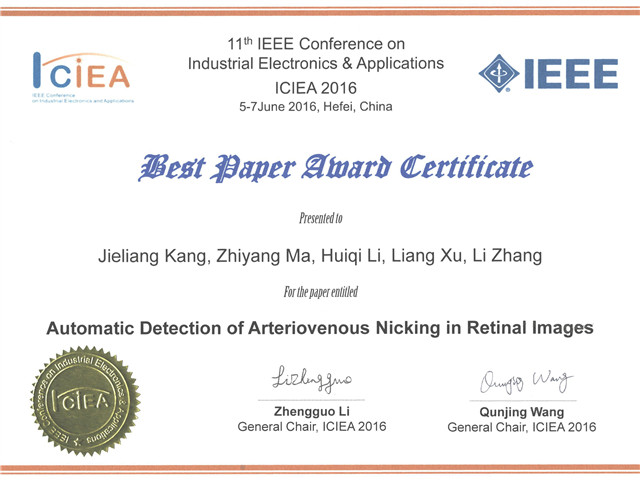 李慧琦教授课题组长期致力于医学图像处理与计算机辅助诊断研究,获奖论文是关于眼底图中动静脉交叉压迫的自动检测研究。动静脉交叉压迫检测对于高血压和动脉硬化的早期诊断具有重要医学研究价值。本论文是与北京同仁医院北京眼科研究所合作发表的,我校为第一作者单位,第一、二、三作者为李慧琦教授课题组研究生康杰靓、马志扬及李慧琦教授,第四、五作者徐亮、张莉为同仁医院合作医生。