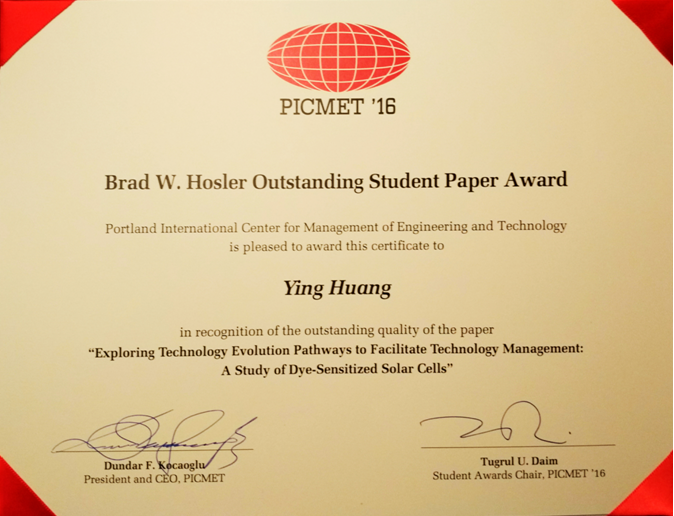 北理工黄颖博士获PICMET国际会议优秀学生论文奖