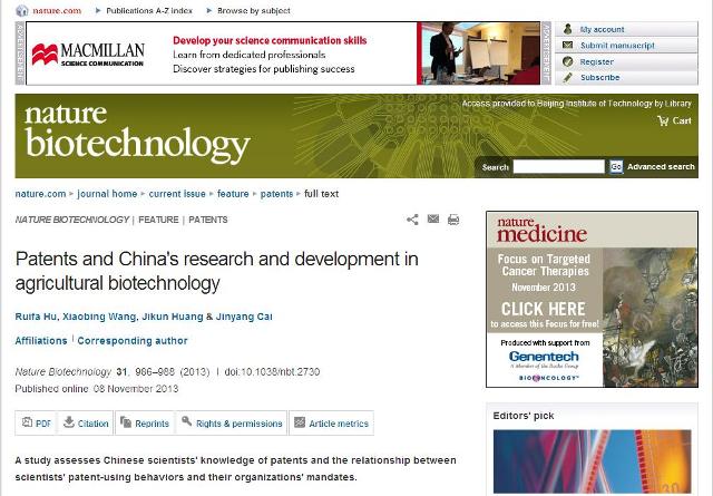 日前,威尼斯8846管理与经济学院胡瑞法教授、蔡金阳博士与中科院农业政策研究中心黄季焜教授、王晓兵副教授合作撰写的论文《Patents and China's research and development in agricultural biotechnology(专利和中国农业转基因生物技术研究)》被国际著名学术期刊《Nature》子刊《Nature Biotechnology》接收并发表。这是作者继去年在Nature Biotechnology上连续发表了两篇论文之后,第三次在该刊发表论文。