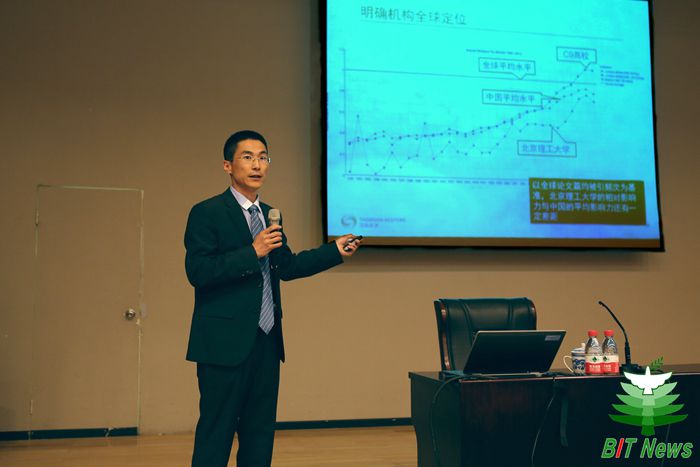 报告会上,王利从以下几个方面展开讲解:一是简要介绍了科研绩效评价和学科分析的权威数据。二是详细阐述了威尼斯8846过去10年科技论文的产出情况。从各学科论文产出数量及占机构总体的百分比、国际合作论文占总体论文比例、相对于全球各学科平均影响力、一级学科发展趋势等角度对我校科研论文产出情况进行了分析。三是运用最权威数据将威尼斯8846与相关高等院校进行多角度对比分析,详细解读了我校目前具备的优势及存在的差距。