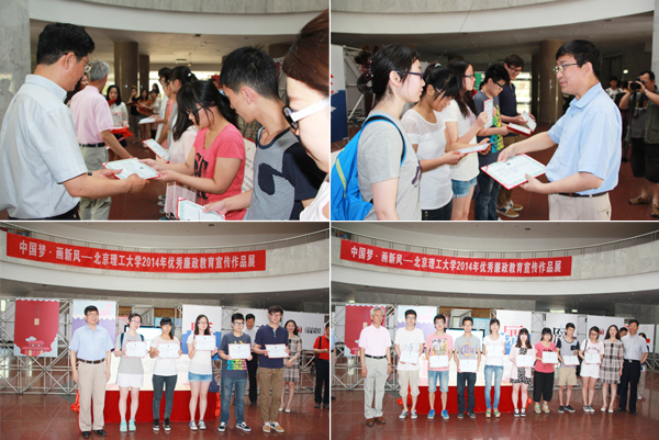 活动结束后到场的校领导与获奖者一起合影留念,并在获奖同学的陪同下参观了作品展。获奖同学热情地向各位领导介绍了自己作品的设计理念和创作过程。同学们纷纷表示在此次活动中受益良多,在运用艺术手段诠释“中国梦·画新风”主题的同时也提高了在专业方面的创新能力。