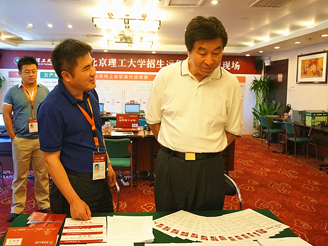 郭大成书记首先查看了设置在招生录取现场的本科招生录取信息统计表,听取了招生就业工作处处长李振键关于近期招生工作开展情况的汇报,询问了已经录取完毕的部分省份的本科一批次、国防生、贫困计划、会计学(中外合作办学)、艺术类等生源情况。当了解到生源大省录取情况尤其“亮眼”,例如我校在北京的理工类录取最低分为640分,文史类录取最低分为618分,录取分数线及排名创近10年最好成绩等情况,郭大成书记对本年度生源质量继续稳步提升和招生录取工作的平稳有序开展表示高度赞赏。他指出,正是因为日常的工作做的非常认真踏实,我校招生工作才能够开展的越来越好。