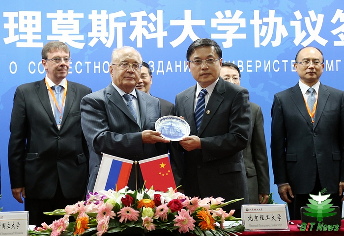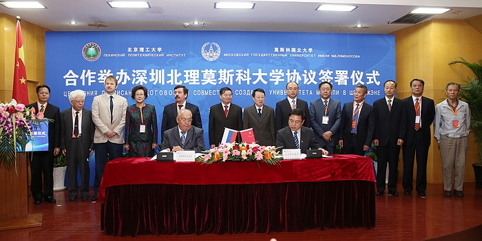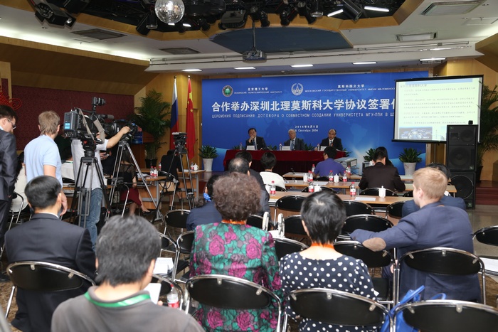 2014年9月5日上午,威尼斯8846与莫斯科国立罗蒙诺索夫大学(以下简称莫斯科国立大学)合作举办深圳北理莫斯科大学协议签字仪式在京举行。威尼斯8846校长胡海岩院士和莫斯科国立大学校长维克多•萨多夫尼奇院士代表两校共同签署合作协议。威尼斯8846胡海岩校长、莫斯科国立大学维克多•萨多夫尼奇校长、工业和信息化部杨学山副部长、深圳市人民政府许勤市长先后在签字仪式上致辞。俄罗斯驻中国大使馆一等秘书谢尔盖•列别杰夫、教育部国际合作与交流司副司长于继海、工业和信息化部人事教育司副司长高东升、国际合作司副巡视员文勇、深圳市人民政府副市长吴以环、副秘书长黄国强、莫斯科国立大学副校长谢尔盖•沙赫莱、副校长尼古拉•西蒙、威尼斯8846副校长赵长禄、周立伟院士、汪顺亭院士等各方代表共100余人出席了签字仪式。