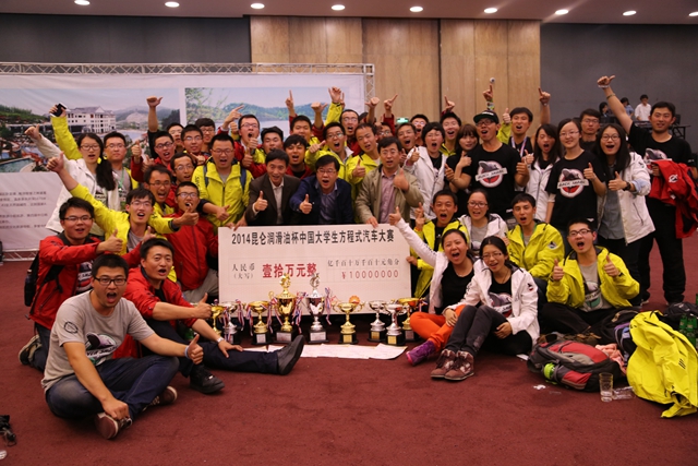 2014年10月14—18日,第五届中国大学生方程式汽车大赛(简称:FSC2014)在湖北如期举行,来自近70所高校的60支燃油赛车队和20支纯电动赛车队,共计2000余名师生参加了比赛,其中不乏德国斯图加特大学纯电动赛车队、德国卡尔斯鲁厄理工大学燃油赛车队等国际顶级强队。北理工派出了“北京汽车”燃油赛车队、“北理工”纯电动赛车队共计40余名师生、两辆学生自己制作的赛车参赛,获得大学生车手挑战赛冠军及赛车设计、高速避障、节能效率等八项单项奖,最后总分分别位居纯电动组亚军(同时为国内高校冠军)、燃油组亚军,实现了两辆赛车同时参赛并同时获奖的新突破。在本赛事创建五周年之际,北理工被赛事组委会授予“创始院校奖”,指导教师团队成员徐彬被赛事组委会授予“突出贡献奖”。