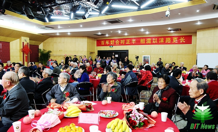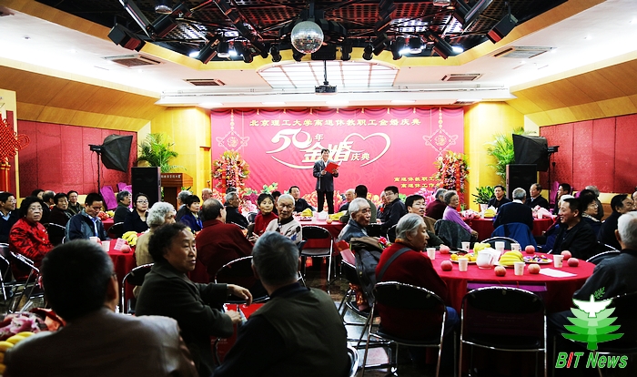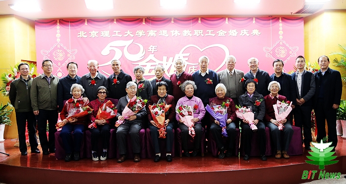 金婚伉俪代表原材料学院李惠生老师发表金婚感言。他感谢党和国家给了大家今天这样的幸福生活,感谢学校领导对老同志的关怀。他表示将毕生的精力奉献给北理工的建设发展和人才培养感到十分幸福,金婚夫妇不离不弃、相濡以沫走过半个世纪既是家庭的幸福,也是对和谐社会的贡献。李老师还表达在有生之年继续关心国家大事,关心学校发展建设,为中华民族的伟大复兴的中国梦贡献微薄之力的美好心愿。