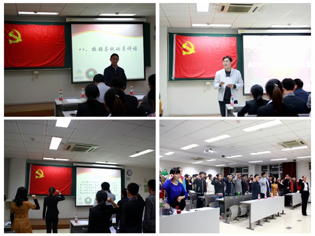 为了推动此项工作的顺利开展,10月31日学校专门召开了APEC志愿者动员大会,校长助理姚利民做了动员讲话,团委书记蔺伟宣读了机场抵离组和国家会议中心组临时党、团支部的组成情况,党员志愿者郑重重温入党誓词、表示一定全力以赴、不辱使命;全体志愿者宣读了北京市志愿者誓词、表示一定遵守各项规定、圆满完成任务;会上,全体志愿者现场签署了《承诺书》。