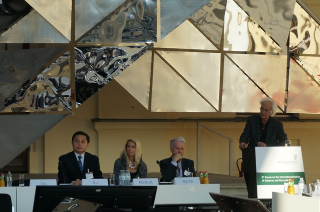 2014年11月7日,胡海岩校长出席德国洪堡基金会主办的“第八届科学和人文国际化论坛”。该论坛以文献计量与学术评价为题,邀请了诺贝尔奖获得者、菲尔茨奖获得者、《Science》主编等十几位科学家做主旨发言。胡校长应邀做了题为《Proper Use of Bibliometrics in Academic Evaluation》的主旨发言。他介绍了中国大学基于文献计量进行学术评价的实践,指出其具有经济、高效等优点,同时会导致片面、功利等问题。他提出应针对学科特点采用不同的文献计量评价与同行评议相结合、引入无量纲化文献计量因子、在管理层中普及文献计量概念等举措,改善现有的评价方法。胡校长还在论坛上与来自多个国家的学者交流,回答了相关提问。