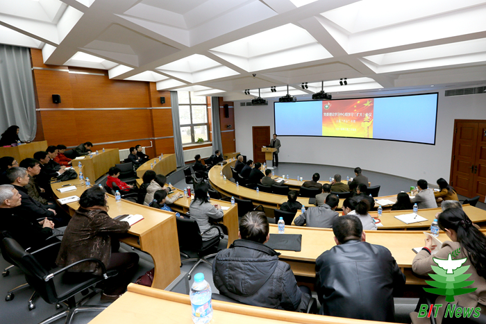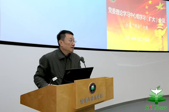 3月25日上午,北理工党委理论学习中心组在主楼133报告厅召开扩大会议,学习传达全国“两会”精神。党委理论学习中心组成员,全国政协委员、各基层党委书记、民主党派代表、党外人士代表参加了会议。会议由张炜书记主持。