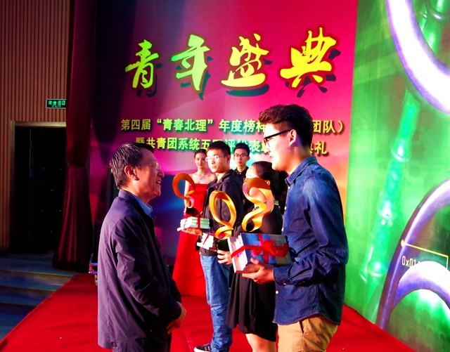 为表彰先进集体和个人,传播青春榜样正能量,5月4日晚,2015年“青年盛典”——第四届“青春北理”年度榜样人物(团队)暨共青团系统五四评优表彰颁奖典礼在中关村校区7号楼报告厅隆重举行。