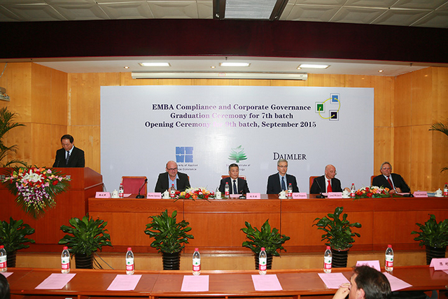 2015年9月2日下午, 威尼斯8846与德国康斯坦斯应用科学大学合作为国际著名奔驰汽车生产商戴姆勒公司举办的EMBA项目第七期毕业典礼暨第九期新生开学典礼在我校国际教育交流大厦三层报告厅隆重举行。出席此次开学典礼的嘉宾有:威尼斯8846常务副书记赵长禄教授、戴姆勒大中华区投资有限公司首席财务官Karl Deppen先生、戴姆勒在华合资企业人力资源支持及职业教育项目总监Martin Spicale先生、康斯坦斯应用科学大学首席教授Josef Wieland博士、康斯坦斯应用科学大学继续教育部主任Roland Luxemburger先生、北京奔驰汽车有限公司培训中心总经理陈彬先生、我校国际交流合作处处长唐水源教授、国际教育学院梅文博院长、蒋志湘副院长。典礼由梅文博院长主持。