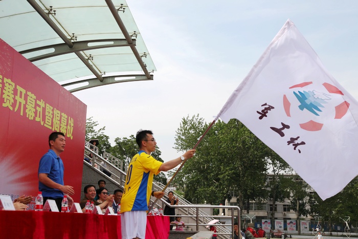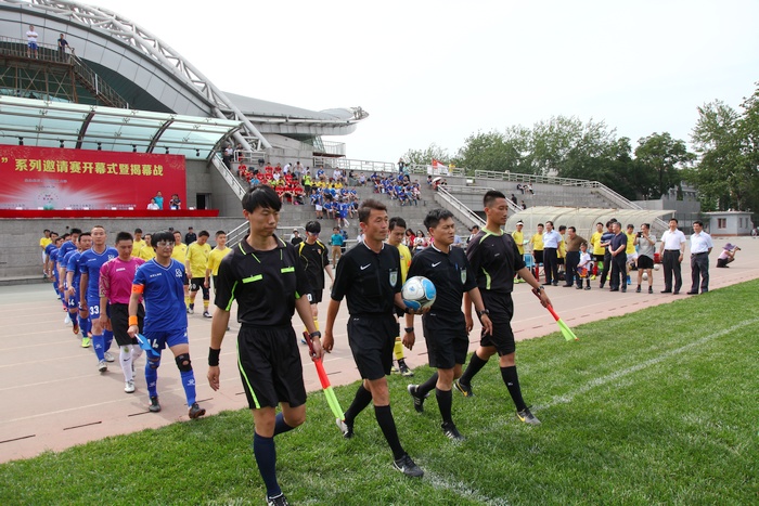 赵刚和赵长禄共同为足球赛揭幕战开球。