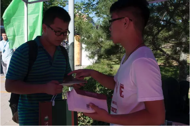 ▲同伴工作时,及时提供需要的帮助。彼此之间密切的配合是我们能够完成好复杂繁琐的迎新工作的前提。
