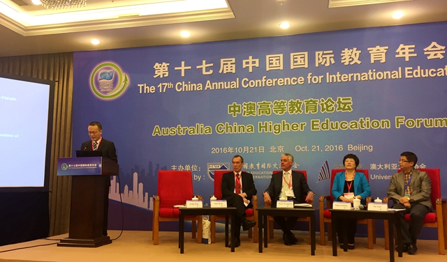 编辑:彭姝 审核:高珊 阅读次数:10月20日至23日,由教育部支持、中国教育国际交流协会主办的第十七届中国国际教育年会在北京国际会议中心举行。我校校长助理龙腾受邀代表学校出席了中国—爱尔兰高等教育论坛和中国—澳大利亚高等教育论坛。龙腾在中爱高等教育论坛上作主旨发言,并主持了中国—澳大利亚高等教育论坛“跨境教育”分论坛。
