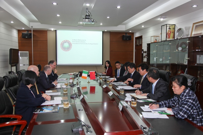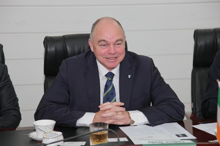 Andrew Deeks校长感谢胡校长的热情接待,并介绍了爱尔兰都柏林大学的校情、专业设置以及科研重点领域。他对两校已有合作,特别是学生交换项目进展表示满意,希望未来进一步开拓学生联合培养和科研合作项目。
