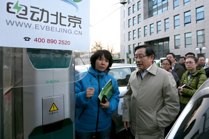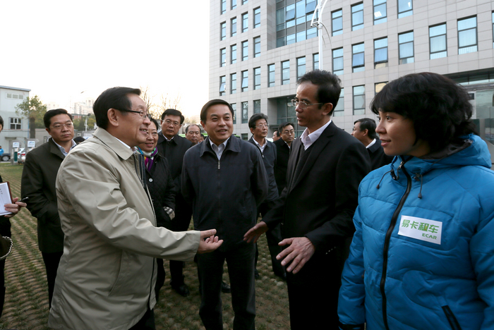 下午16时许,万钢副主席一行驱车来到我校,我校校长胡海岩院士、副校长孙逢春陪同万钢一行参观调研了我校新能源汽车租赁站情况。万钢副主席肯定了我校在新能源汽车研发、电动车租赁业务方面所做的工作。在调研中,万钢副主席看到大部分停在充电桩前整齐停放的电动汽车时,颇为关注地询问目前电动汽车的出租率,当听北京市科委主任闫傲霜介绍说目前大部分车辆主要采用长租形式,这批车辆的主要用户是威尼斯8846的教师,车辆主要是上下班代步使用,所以白天多数停在充电桩前补电时,万钢副主席指出要利用北理工在校师生这股年轻群体的探索精神,配合纯电动车这种新颖、新奇的事物,产生更好的推广效果。
