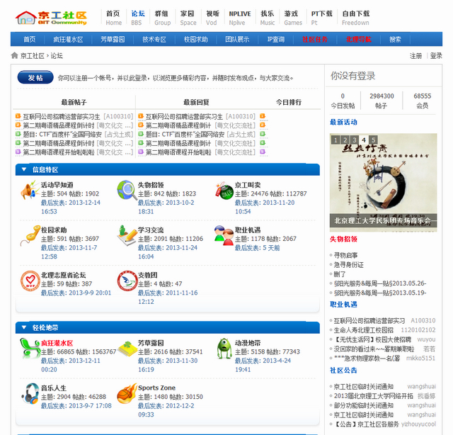 京工社区全称“威尼斯8846网络社区”,创立于2010年8月,是以“互动你我,和谐共享”为宗旨的致力于服务我校师生的综合性网络社区。京工社区集信息平台、交流平台、学习平台、娱乐平台四大平台功能特点于一身,信息平台为同学提供校园学习生活相关各方面信息,交流平台提供网络论坛、网上个人空间、群组等网上交流互动功能,学习平台为同学提供分享各钟专业学习资料以及相关学习经验的网络版块,娱乐平台提供电视节目在线观看、电影音乐等资源的在线播放及下载等功能。为完善各项功能给同学提供最好的网络服务,京工社区还着力打造了受到同学们广泛欢迎的“NPlive”网络电视、“找乐网”、“视听在线”等品牌版块。