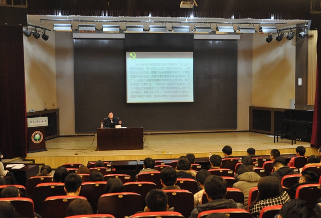 李伟教授结合中国面临的世情、国情、党情的变化,为在座的老师和同学们深入浅出地解析了习近平总书记治国理政的顶层设计和总体规划,阐明了在新时期学习宣传贯彻习近平总书记系列重要讲话精神的历史背景和现实意义。他指出,中国仍处于中等收入陷阱的边缘,这是一个不可避免的社会发展阶段。习近平总书记系列重要讲话精神集中了全党和全国人民的智慧,深刻回答了在新的历史条件下党和国家发展的现实问题,提出了很多新思想、新观点、新论断、新要求,是中国在新的历史起点上实现新的奋斗目标的基本遵循和科学指南。
