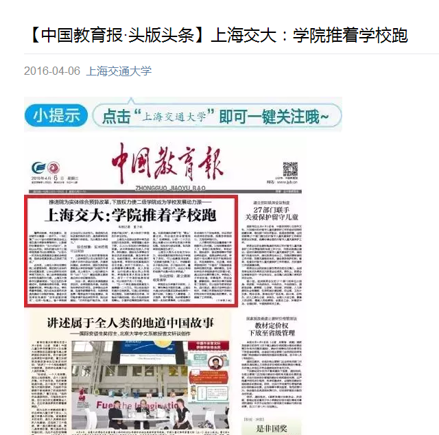 原文标题:【中国教育报·头版头条】上海交大:学院推着学校跑