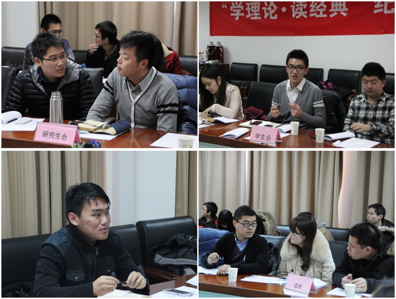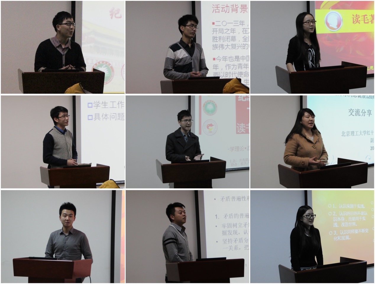此次读书活动以纪念毛泽东同志诞辰120周年为契机,选取毛泽东经典著作:《矛盾论》、《实践论》为学习内容,号召学生干部在新的时代背景下重读经典著作,从“老”书中研读出“新”的感悟,深入挖掘毛泽东同志留下的精神财富,从而进一步提高学生干部的理论水平与实践能力,充分利用理论知识解决学生工作中存在的矛盾,利用实践中总结的经验建立更好的工作方法。与此同时,从自身做起,带动更多的同学树立“学理论•读经典”的意识。