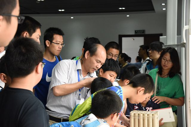 实验室黄广炎副主任通过高速摄影拍摄到的爆炸过程等视频影像,向大家进一步展示爆炸过程。重点实验室王芳副教授对导弹、弹头、战斗部等相关展出模型逐一进行了详细的介绍。大家通过近距离观察,亲手触摸模型和组件,进一步加深了对爆炸的感性认识。李增义老师向大家科普了如何利用烟花组件及其效果件完成北京奥运和上海世博会等大型活动焰火表演中的“大脚印”和“笑脸”的特效制作。同学们全神贯注地听讲,认真思考小器件凝聚的大智慧。此外,展室陈列的重大科技创新成果展板同样吸引了众人的目光,大家纷纷提问,专家一一进行讲解,将深奥的科研成果以通俗易懂语言展现出来。